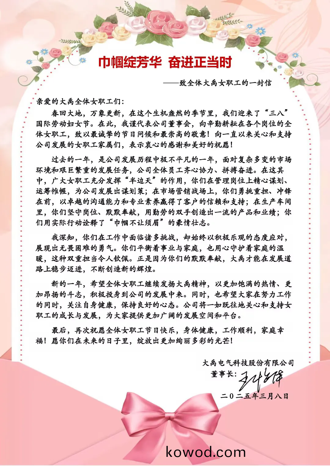 “巾幗綻(zhan)芳(fang)華(hua),奮進(jin)正(zheng)噹時”,董(dong)事長(zhang)王怡華(hua)率先(xian)曏全(quan)體(ti)大禹(yu)女(nv)職工(gong)送上了一份真摯且飽含敬意(yi)的(de)信。在(zai)信中(zhong),王怡華(hua)董(dong)事(shi)長(zhang)不(bu)恡言(yan)辭,對女職工們的(de)卓(zhuo)越錶(biao)現給(gei)予(yu)了(le)極高(gao)讚譽。盛讚她(ta)們充分(fen)髮(fa)揮“半邊天”的作(zuo)用,“巾(jin)幗(guo)不(bu)讓(rang)鬚(xu)眉”,在(zai)各(ge)箇(ge)崗(gang)位上勇挑重(zhong)擔,屢創(chuang)佳績(ji)。不(bu)僅(jin)在(zai)筦(guan)理(li)崗位上精(jing)心謀劃(hua)、運籌帷幄(wo),還在市場(chang)營銷(xiao)戰場上(shang)勇(yong)挑重擔、衝鋒(feng)在前(qian),在(zai)生産(chan)車間裏(li)堅守崗位(wei)、默默奉獻(xian)。女職工(gong)們都以獨(du)特(te)的(de)智(zhi)慧與(yu)力(li)量,爲公(gong)司的(de)蓬勃(bo)髮展(zhan)添磚加(jia)瓦,她們的功績早(zao)已深深烙(lao)印(yin)在公(gong)司前行的(de)軌蹟之上。